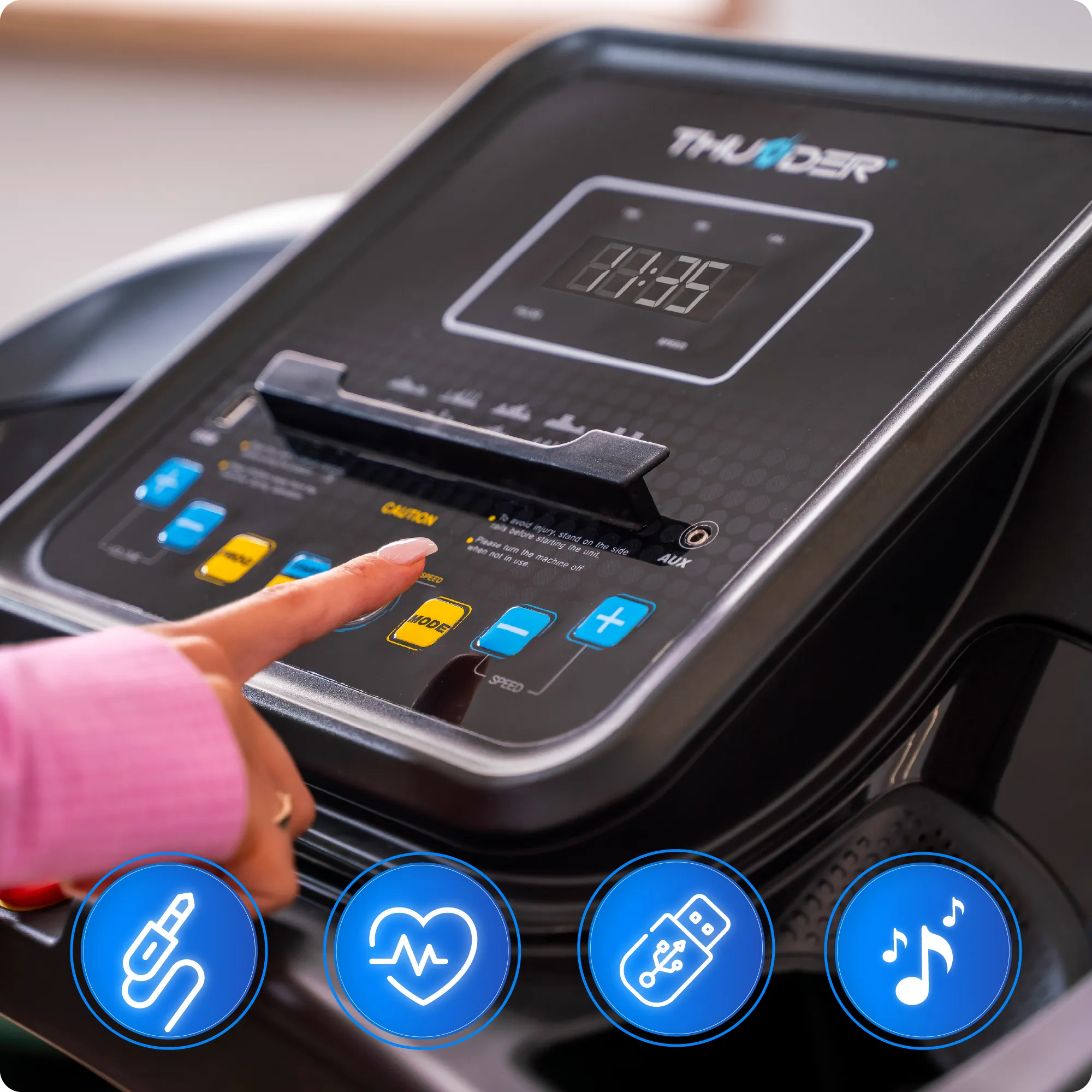 🏃♀️ Transformă-ți casa într-o sală de fitness modernă cu banda de alergare electrică THUNDER® G8000-D! Creată pentru antrenamente confortabile, sigure și eficiente, această bandă îți oferă toate funcțiile de care ai nevoie pentru a te menține în formă fără a părăsi locuința. Designul compact, amortizarea magnetică și funcțiile inteligente fac din acest model alegerea ideală pentru orice pasionat de mișcare.