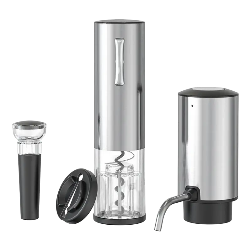 Include 4 accesorii esențiale: tirbușon, dop de vid, cuțit și aerator