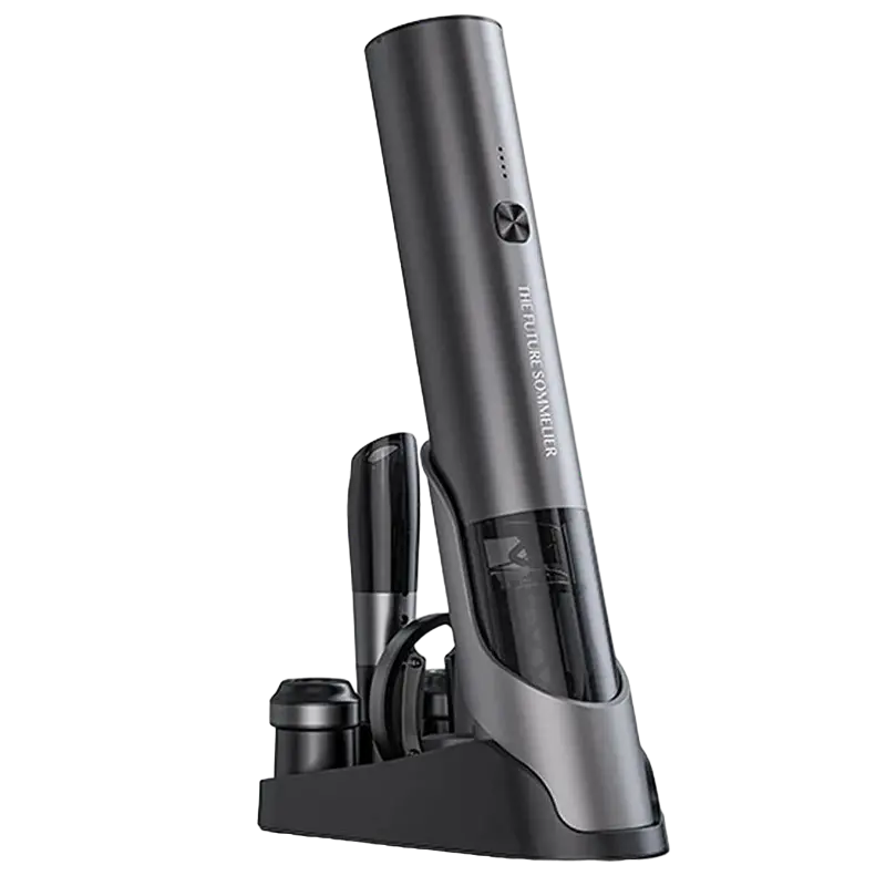• Set complet de 5 piese: tibușon electric, aerator, 2 dopuri, cuțit, suport și cablu de încărcare