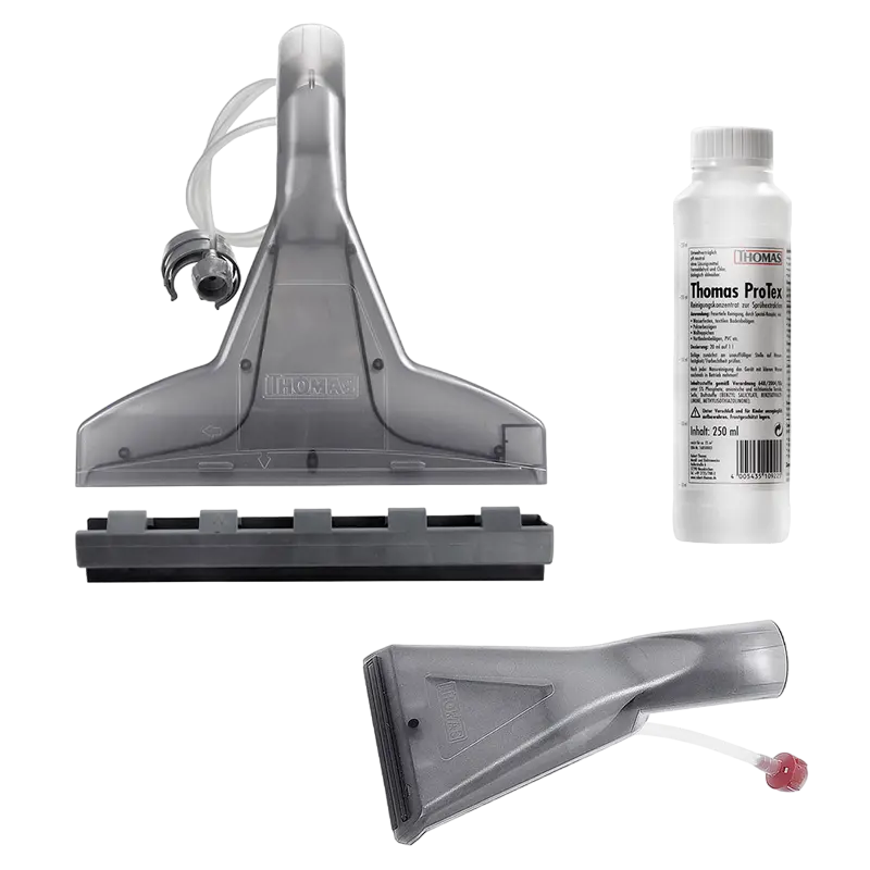 Accesorii incluse: perie turbo, duză pentru crăpături, unelte pentru îndepărtarea părului, 2x duză pulverizare apă, sac, concentrat ProTex