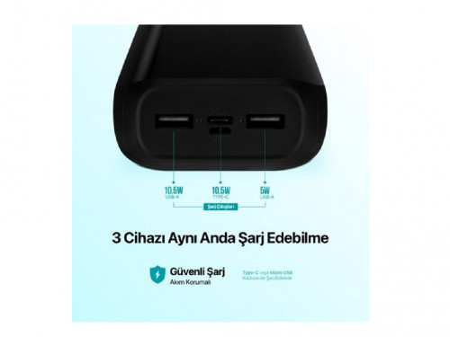 Powerbank cu capacitate mare de 30.000 mAh, ideal pentru încărcarea repetată a smartphone-urilor, tabletelor și altor dispozitive mobile. Oferă ieșire de până la 2.1 A și putere totală de 10.5 W, asigurând o încărcare stabilă și eficientă. Designul compact și finisajul negru îl fac potrivit pentru utilizare zilnică și călătorii. Dispune de protecții integrate împotriva supraîncărcării, supratensiunii și scurtcircuitelor. Echipat cu multiple porturi pentru compatibilitate extinsă: 2× USB Type-A, 1× USB Type-C și 1× Micro USB.