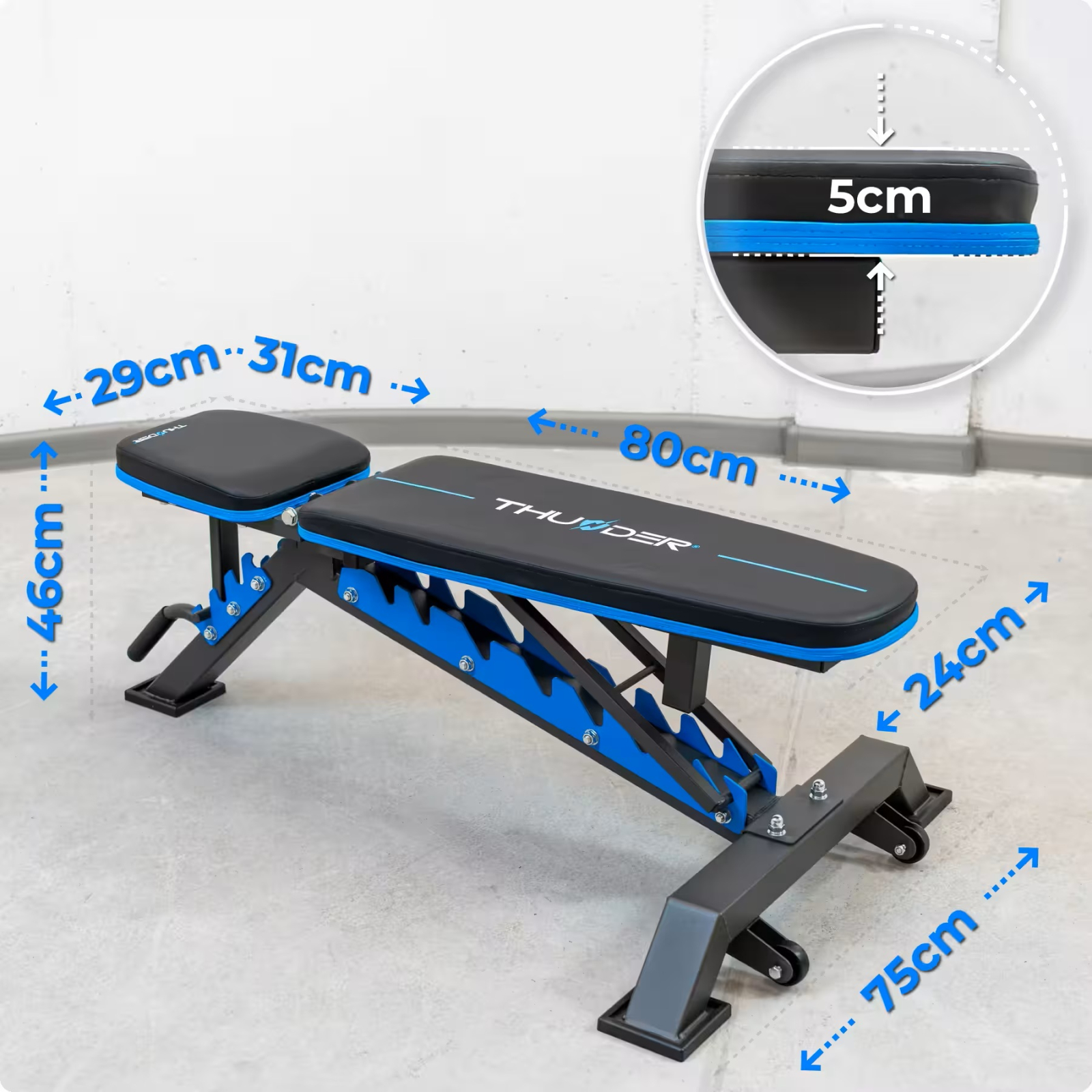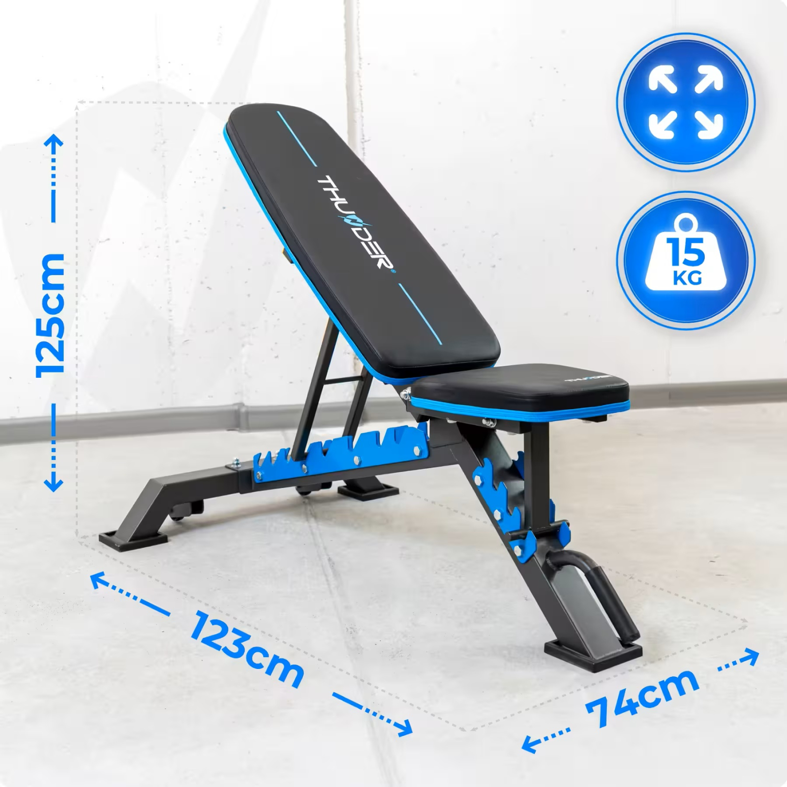THUNDER Скамья для тренировок регулируемая THUNDER GRYND – 8 положений спинки + 4 положения сиденья, складная, 15 кг – Полный и безопасный тренинг дома!