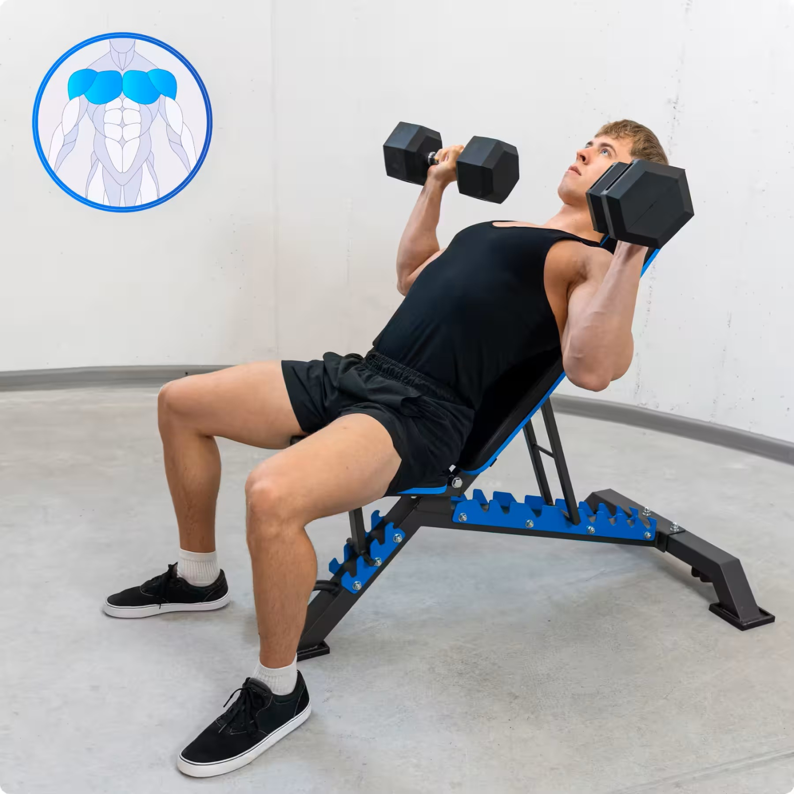 • Жим на плечи (положительный угол) — передние дельты и плечи