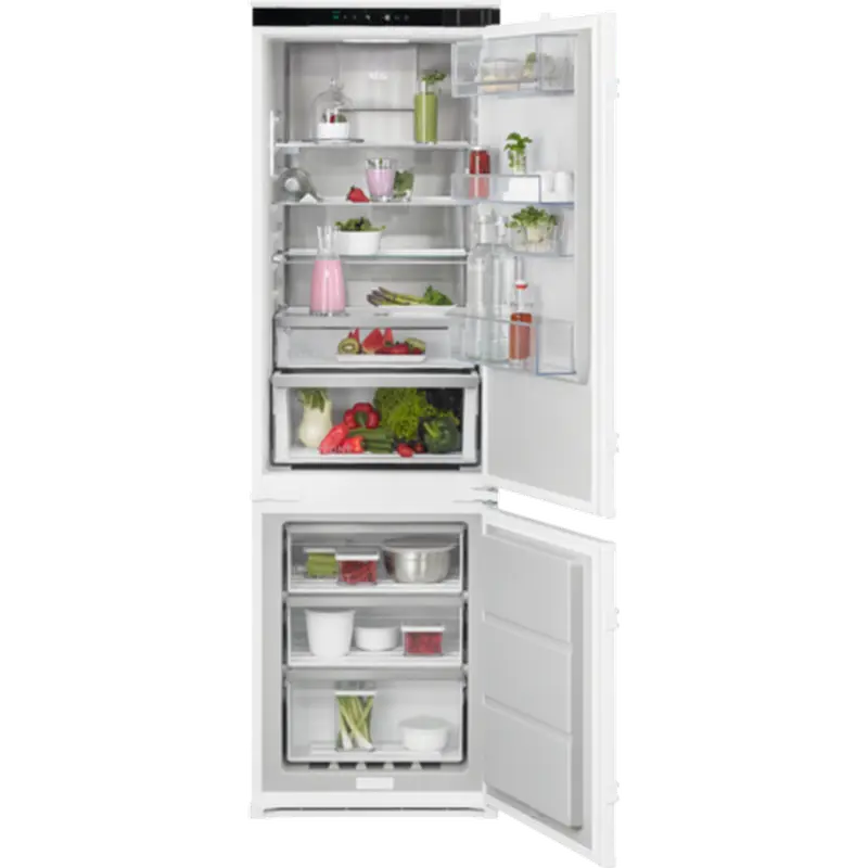 Встраиваемый холодильник AEG TSC8M181DS сочетает компактный современный дизайн с технологией автоматического поддержания свежести. Общий полезный объем 249 л включает холодильник и морозильник с автоматической разморозкой, обеспечивая функциональное и эффективное хранение для кухонь среднего размера.