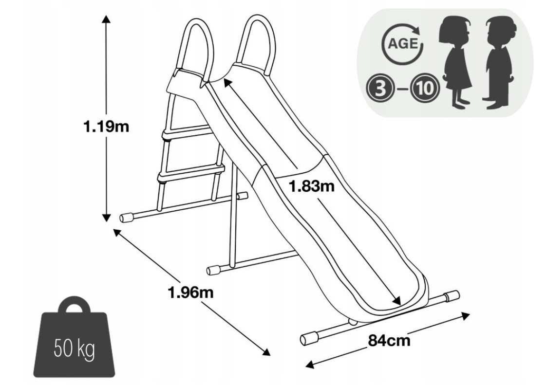 Длина ската – 183 см, а общие габариты – 196x84x119 см, идеально подходят как для домашнего двора, так и для игровых площадок. Максимальная нагрузка – 50 кг, рассчитана на одного ребёнка. Яркий голубой цвет придаёт горке привлекательный внешний вид.