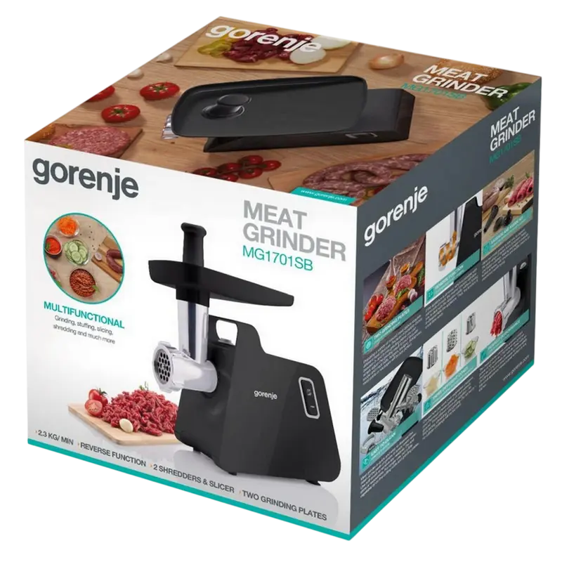 Мясорубка Gorenje MG1701SB обеспечивает высокую производительность и безопасность для переработки мяса дома. С мощностью 1700 W и производительностью 2,3 кг/мин она измельчает мясо быстро и эффективно. Функция реверса и защита от перегрузки предотвращают застревание и перегрузку, а насадка для колбас и 2 диска 3/8 мм обеспечивают разнообразие блюд.